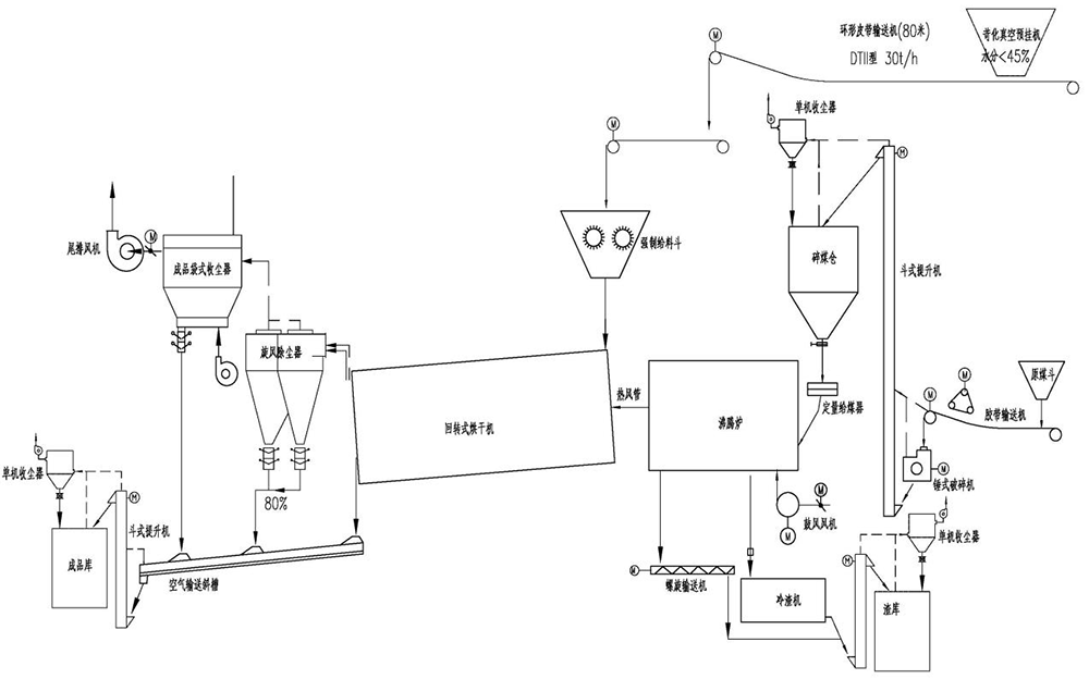 為了適應環保政策,造紙廠苛化白泥(或綠泥)從預掛機出來后,通過膠帶輸送到白泥烘干系統經過烘干、除塵后入散裝粉體庫,散裝外運出廠到水泥廠或攪拌站等下游用戶使用。 熱風爐可以采用燃煤沸騰爐或燃氣(油)熱風爐。